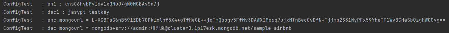 : junit 테스트를 통해, 암호화할 String 문자열의 출력값을 확인해봅시다. mongo uri의 암호화된값(enc_mongourl)이 로그에 찍히는걸 확인후, application-yml 를 향후에 수정해줄겁니다.