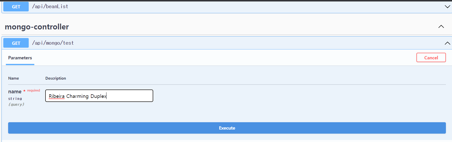 이제 정상적으로 BlogApplication 구동후, MongoDB에서 특성name을 파라미터로 하는 get api 요청을 날려보겠습니다.